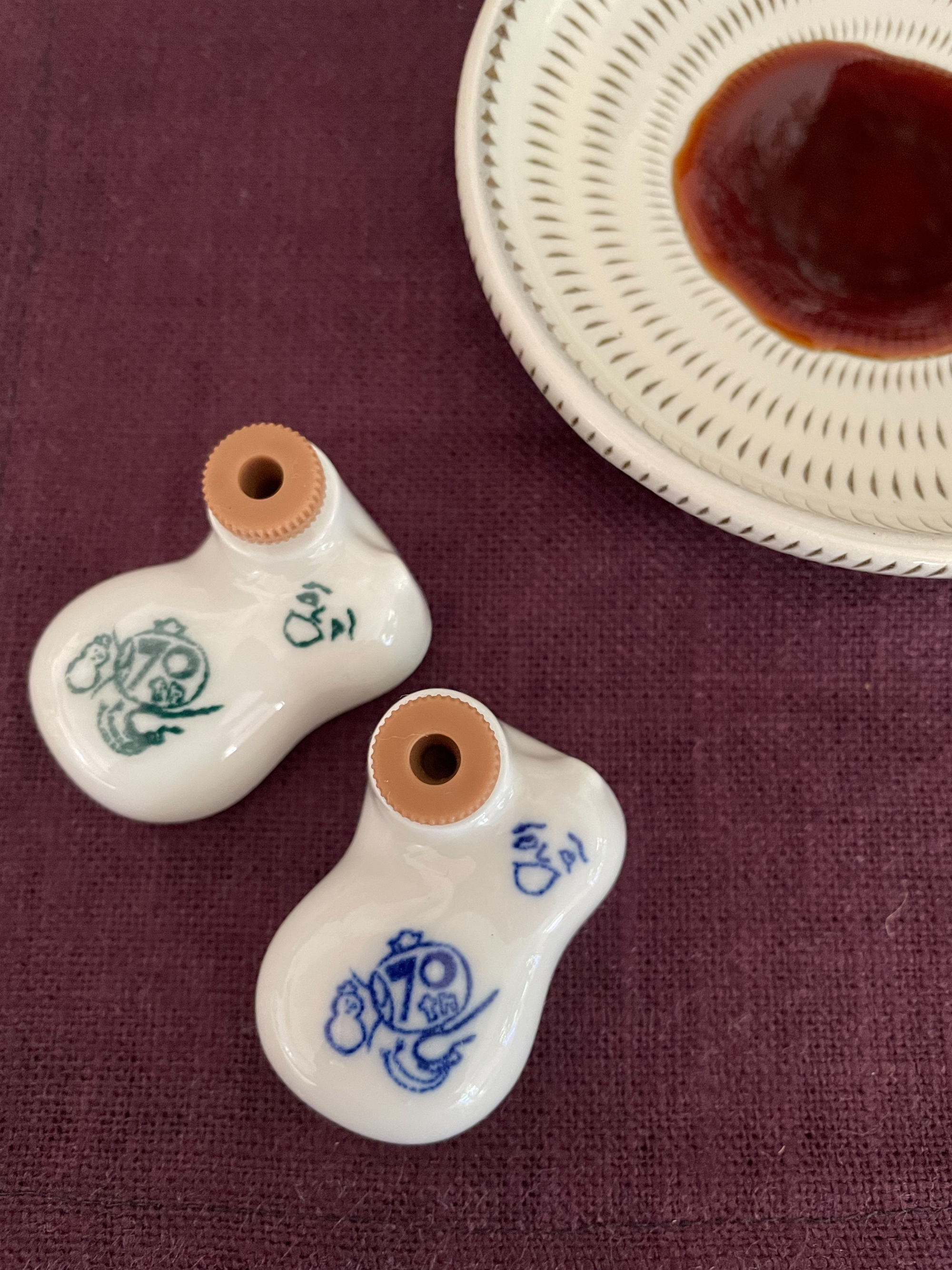 據說崎陽軒燒賣誕生時的醬油壺是小玻璃瓶。二戰後改為葫蘆型的白色瓷瓶。1955年,漫畫家橫山隆一(代表作:《フクちゃん》)為它添上了鼻子和眼睛,葫蘆娃被賦予了生命。第一代葫蘆娃共有48種圖案,懷舊感十足又不乏個性。之後,第二代葫蘆娃的設計來自插畫家原田治先生。這個時期,瓶塞從軟木變成了現在依舊使用的橡膠塞。回想起來,小時候記憶中的葫蘆娃確實是軟木塞的玲瓏小器。現在的第三代葫蘆娃,從2003年再次使用了第一代的圖案。另外除了不定期出現的「聯動版葫蘆娃」,還有特別的版本例如60週年時登場的、穿了紅色馬甲的「花甲葫蘆娃」。
